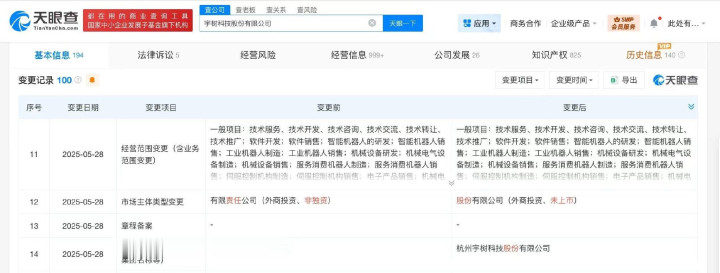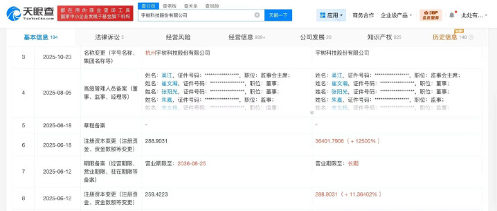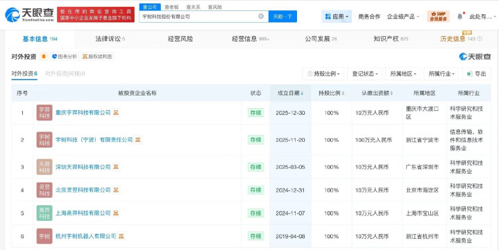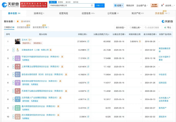 天眼查工商信息显示,宇树科技关联公司宇树科技股份有限公司成立于2016年8月,法定代表人为王兴兴,注册资本约3.64亿人民币,经营范围含软件销售、智能机器人的研发、智能机器人销售、工业机器人制造、工业机器人销售、机械设备研发等。股东信息显示,该公司由王兴兴、汉海信息技术(上海)有限公司、宁波红杉科盛股权投资合伙企业(有限合伙)、上海宇翼企业管理咨询合伙企业(有限合伙)等共同持股。对外投资信息显示,该公司在内地直接持股6家企业,均为存续状态。值得一提的是,2025年以来,宇树科技已成立多家新公司,包括重庆宇羿科技有限公司、宇树科技(宁波)有限责任公司、深圳天羿科技有限公司。此外,该公司已多次增资并多次更名。