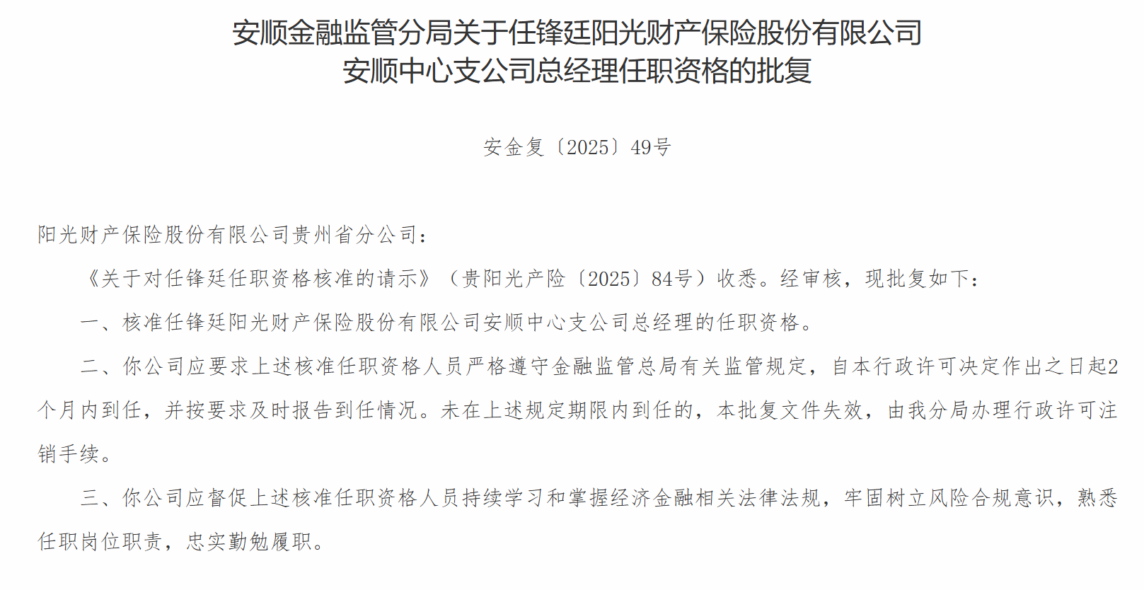12月26日,安顺金融监管分局发布关于任锋廷阳光财产保险股份有限公司安顺中心支公司总经理任职资格的批复,核准任锋廷阳光财产保险股份有限公司安顺中心支公司总经理的任职资格。